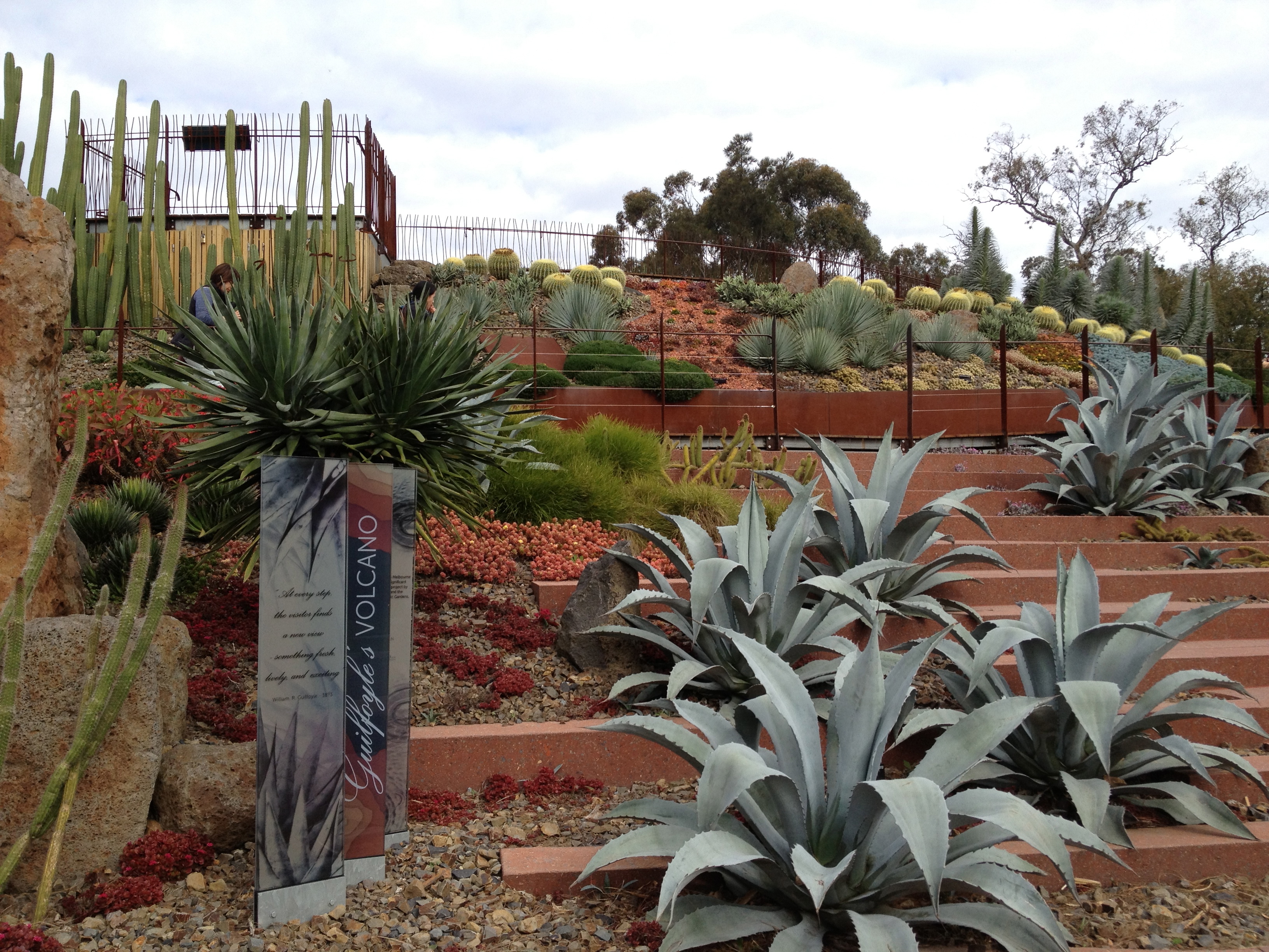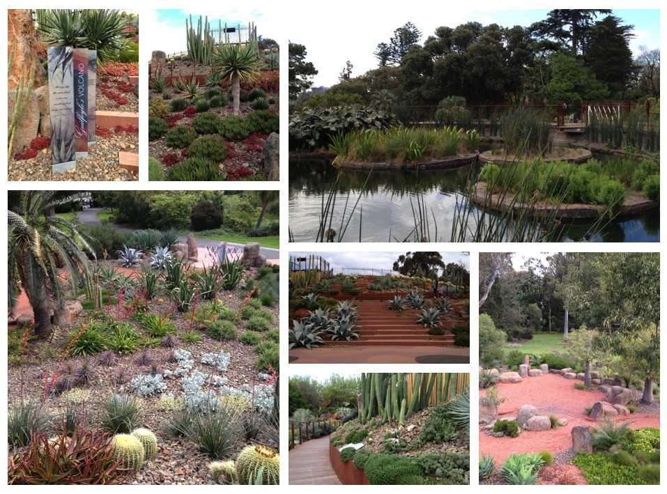 Paths wind through plantings of cacti, succulents and other low water use species mulched with rocks and pebbles and spiral up the volcano to viewing platforms surrounding the crater lake, that also offer views across the Gardens and beyond.