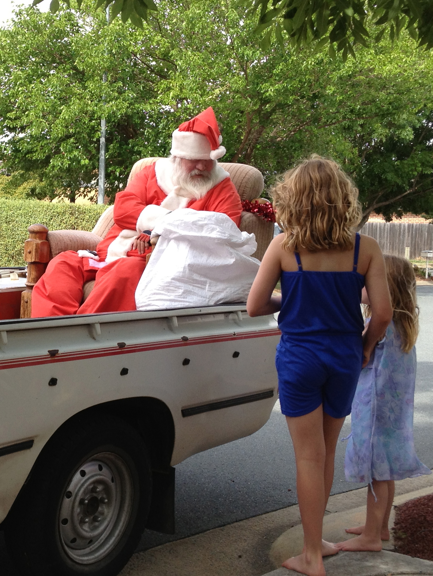 A good friend of mine, Brendo, donates his time each December to spread Christmas cheer and glad tidings across the region. He bolts an armchair and two dining room chairs to the tray of a ute, dons his Santa suit, and is driven around the suburbs of Canberra by ‘Rudolph’ giving away lollies in the middle of the hot Australian summer.