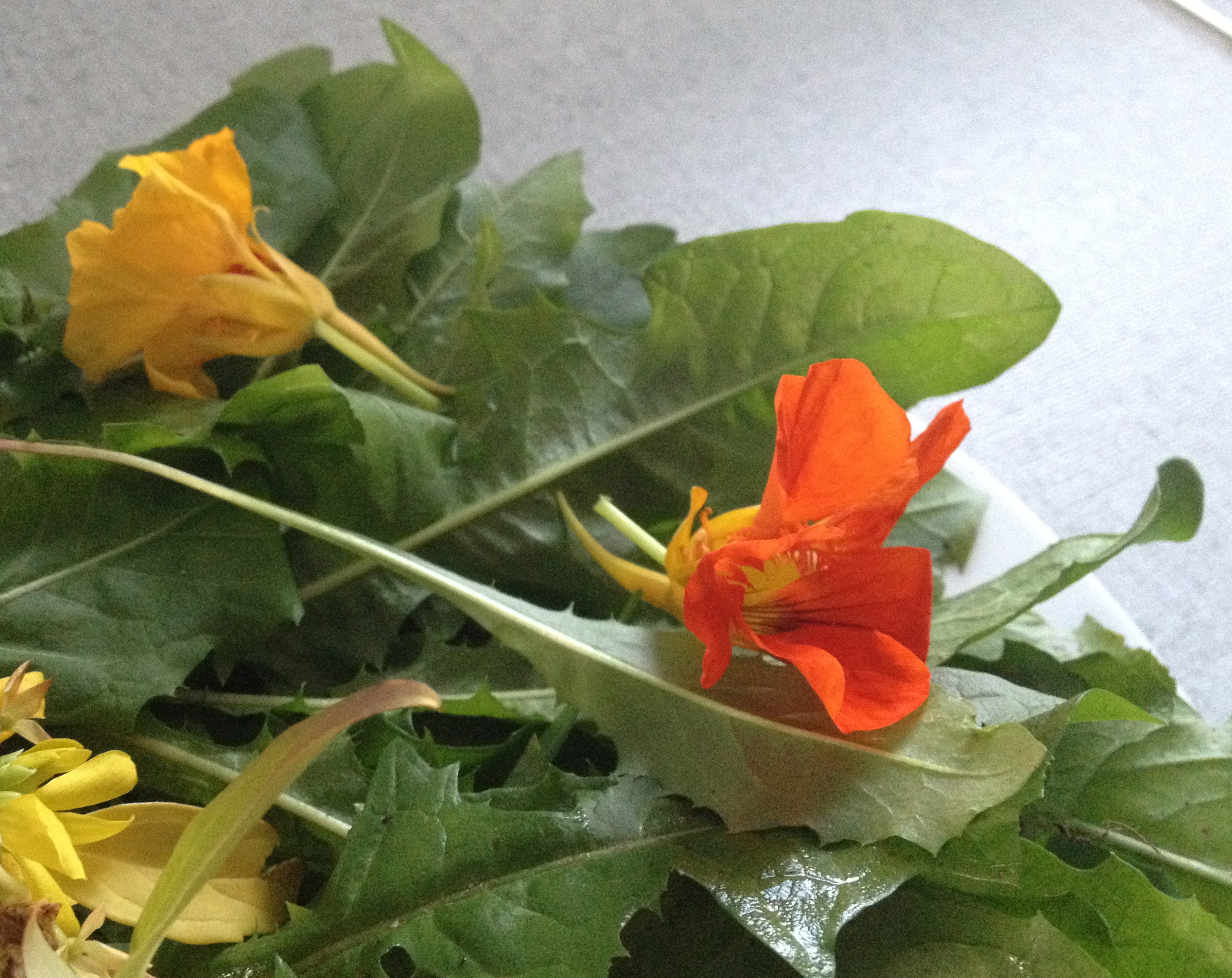 In addition to dandelion main courses, I might try filling the last of the nasturtium flowers from my neighbour’s garden with guacamole as an entree (e.g. here) and perhaps even finish with a dessert using calendula petals in banana cake with maple cream cheese icing or a savoury Calendula cornbread.